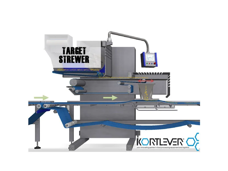 THE STREWER CAN COME EQUIPPED WITH INGREDIENT RECOVERY CONVEYORS TO RE-USE EXCESS INGREDIENTS. FOR MORE ACCRURACY THE 'TARGET' STREWER IS USED TO TARGET THE INGREDIENTS ONTO THE PRODUCT FROM A RETRACTING CONVEYOR INTO A GUIDE.